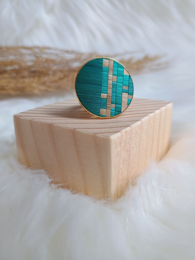 Bague plateau modèle Rond mosaïque et paille droite verte/dorée