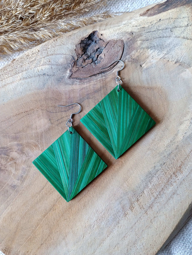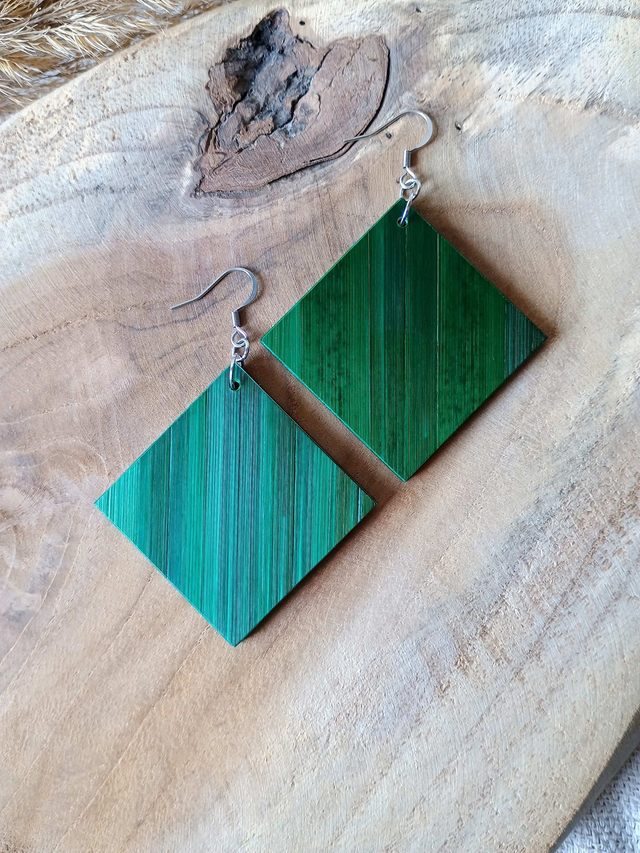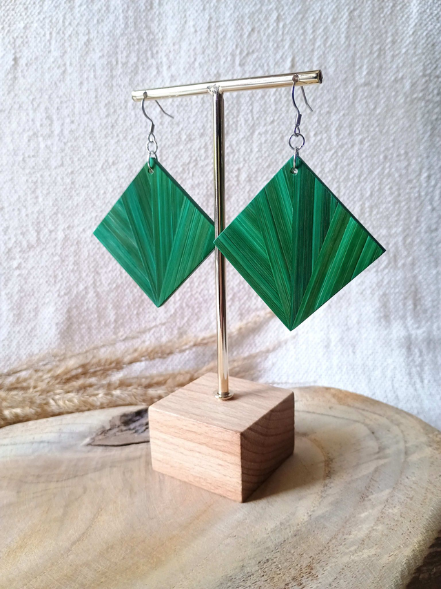 Boucles d'oreilles modèle Carré motif éventail vert jungle