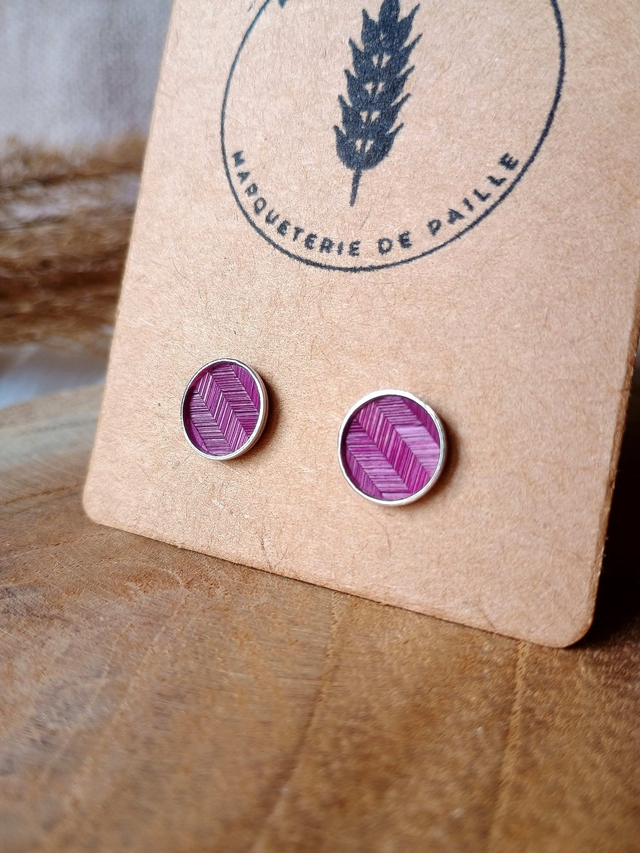 Clous d'oreilles argentés motifs chevrons paille de seigle violine.