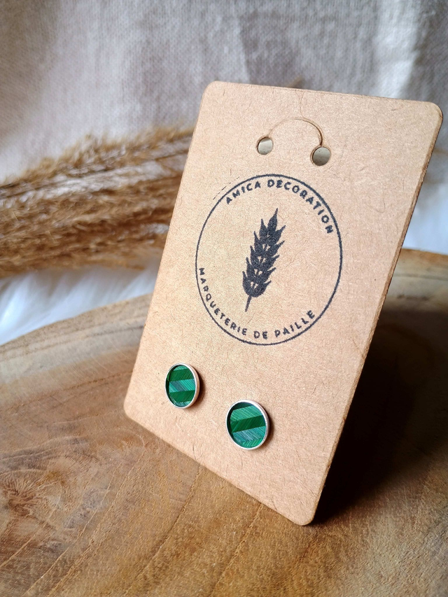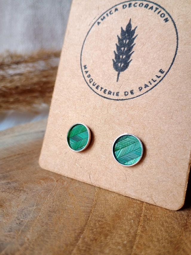 Clous d'oreilles argentés motifs chevrons paille de seigle verte.