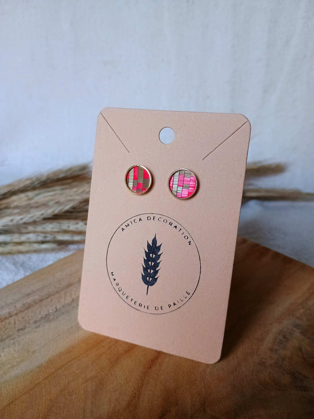 Clous d'oreilles dorés motifs mosaïque paille de seigle rouge/dorée.