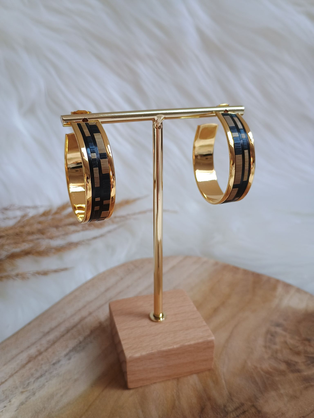 Boucles d'oreilles créoles larges mosaïque noire et dorée