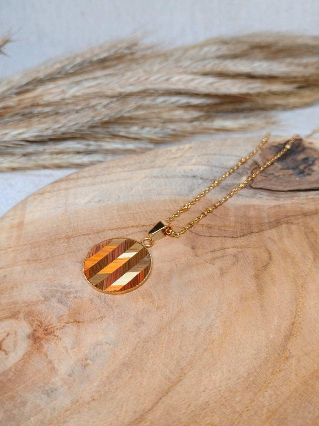 Collier MÉDAILLON Chevron Bois- Acier inoxydable doré