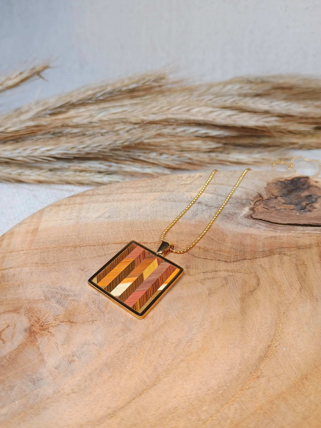 Collier médaillon carré motif chevrons coloris bois