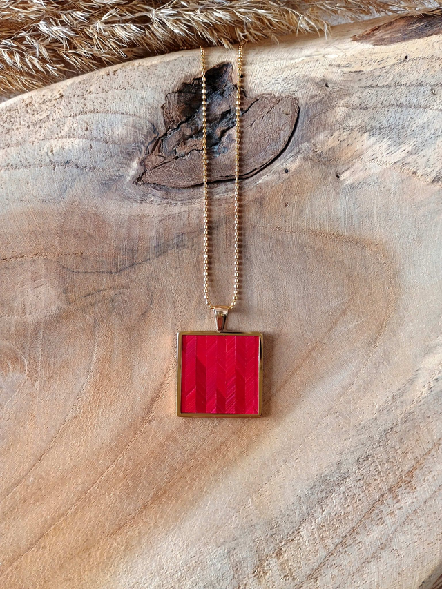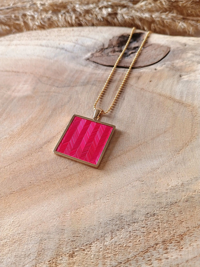 Collier médaillon carré doré à l'or motif chevrons coloris rouge
