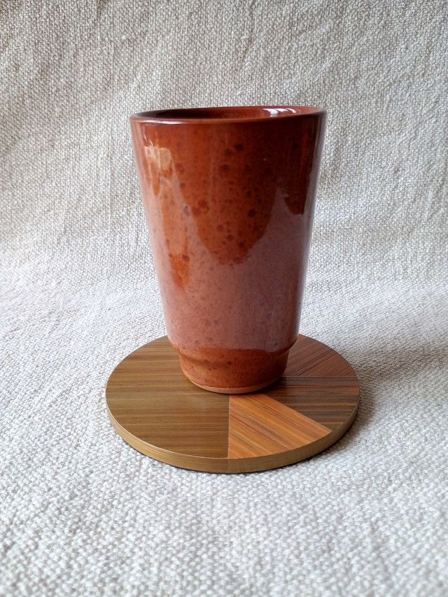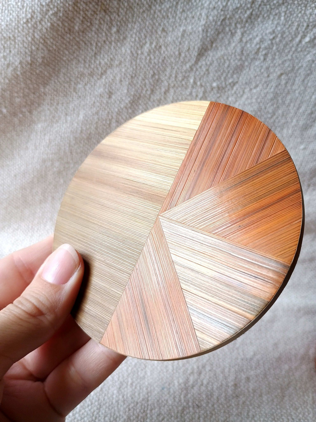 Sous-verre Collection BOIS, marqueté de paille de seigle de couleur bronze et cognac, motif éventail.