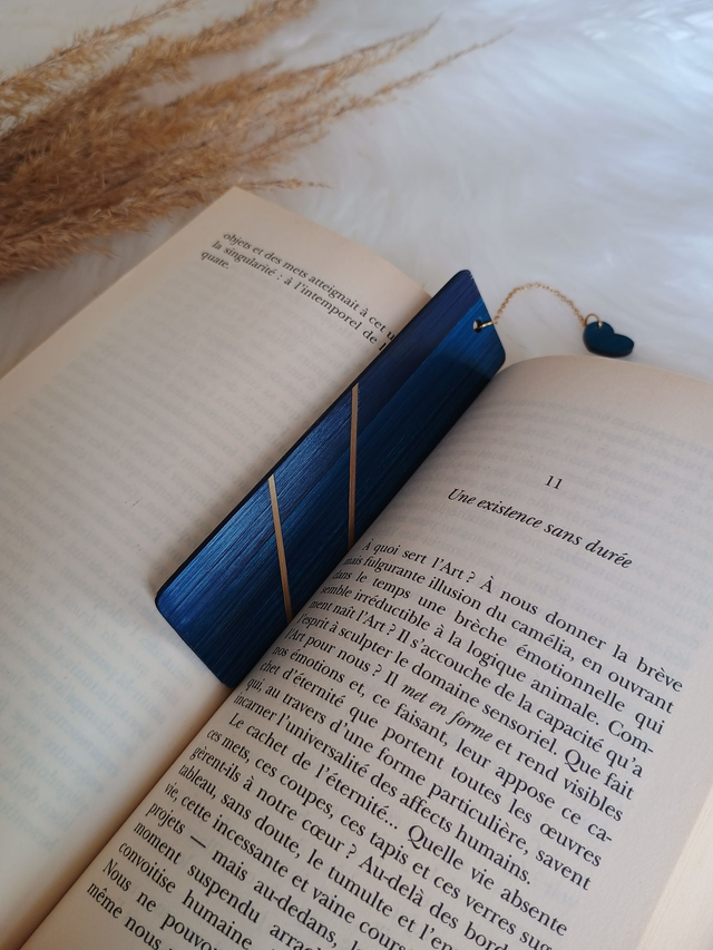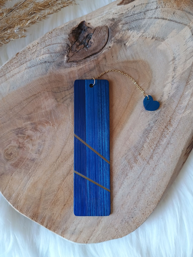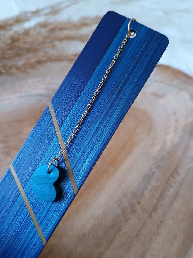 Marque-pages avec chaînette cœur, en bois plaqué d'une marqueterie de pailles bleues et filets dorés.