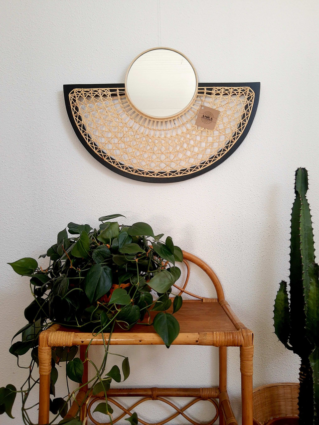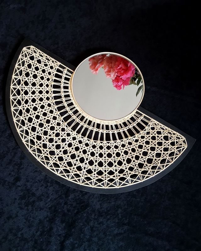 Miroir en rotin & cannage en éventail. A suspendre ou à poser.