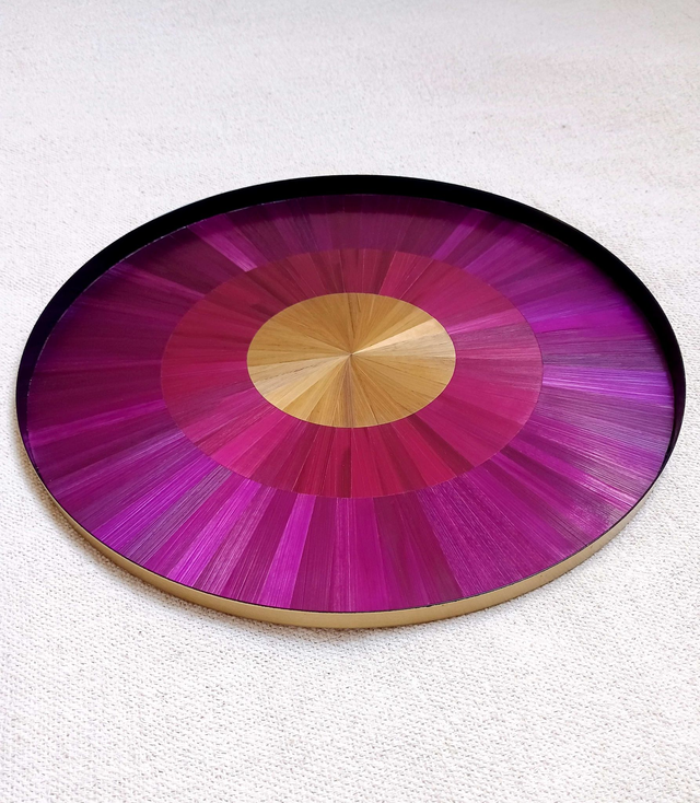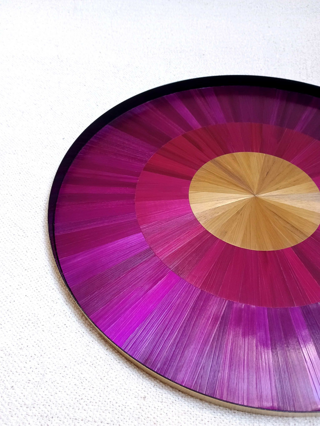 Objet décoratif marqueté de pailles de seigle, coloris doré, bordeaux et violine - motif soleil.