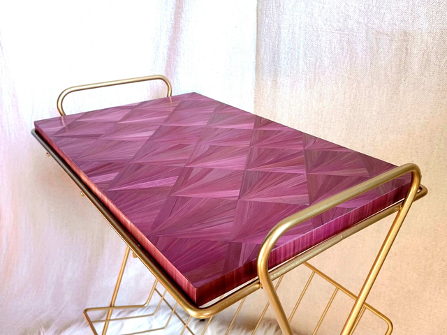 Sellette des années 70 habillée d'une jolie marqueterie de pailles bordeaux, motifs éventails.